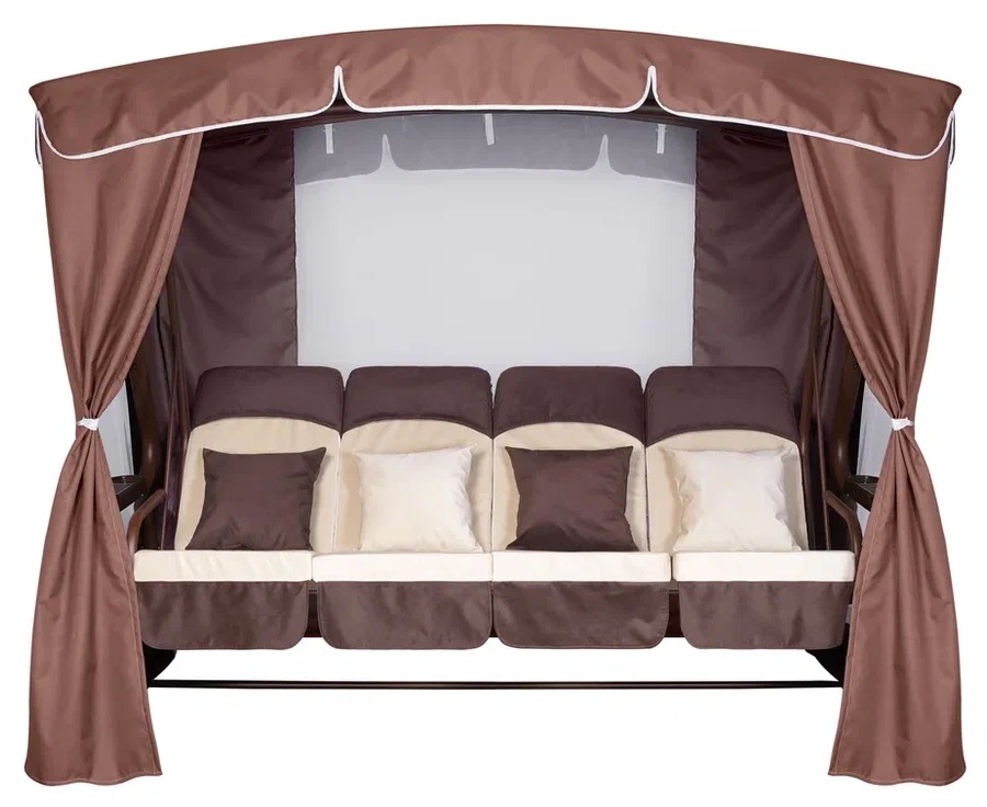 У нас вы можете купить мягкое сиденье для садовых качелей Золотая корона 76. Такой матрас подойдёт для длины сиденья 200 см, оно выполнено в коричнево-бежевом цвете. Текстильный комплект изготовлен из плотной ткани с водоотталкивающей пропиткой. В качестве наполнителя используется листовой поролон 10 см. Глубина сидения 60 см , а высота спинки 70 см. Это наиболее долговечный вариант, который хорошо подходит для использования на улице. Чехлы подушек являются съёмными, их с лёгкостью можно постирать в стиральной машинке при необходимости.